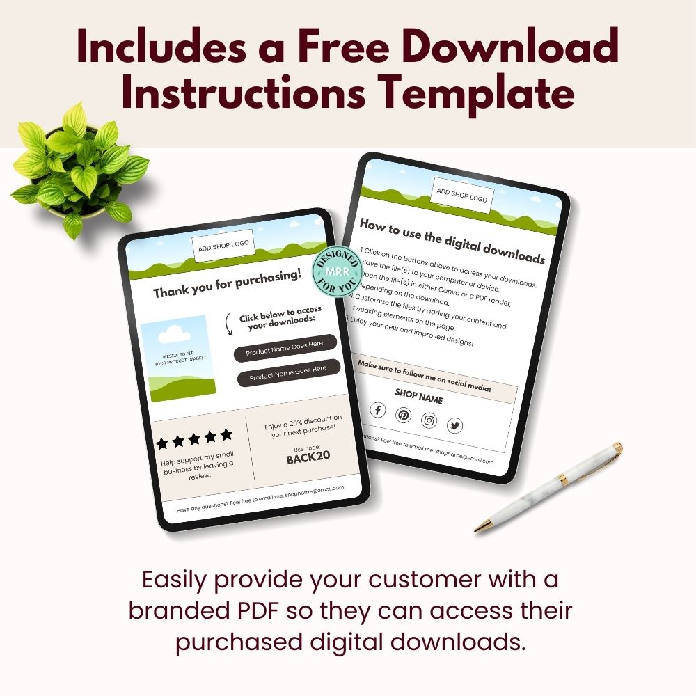 • Free Delivery Template -Each purchase includes a delivery instructions template, editable in Canva! Use this FREE Canva template to personalize it, insert your template links, and then save it as a PDF. Your customers will then be able to easily access their digital product.