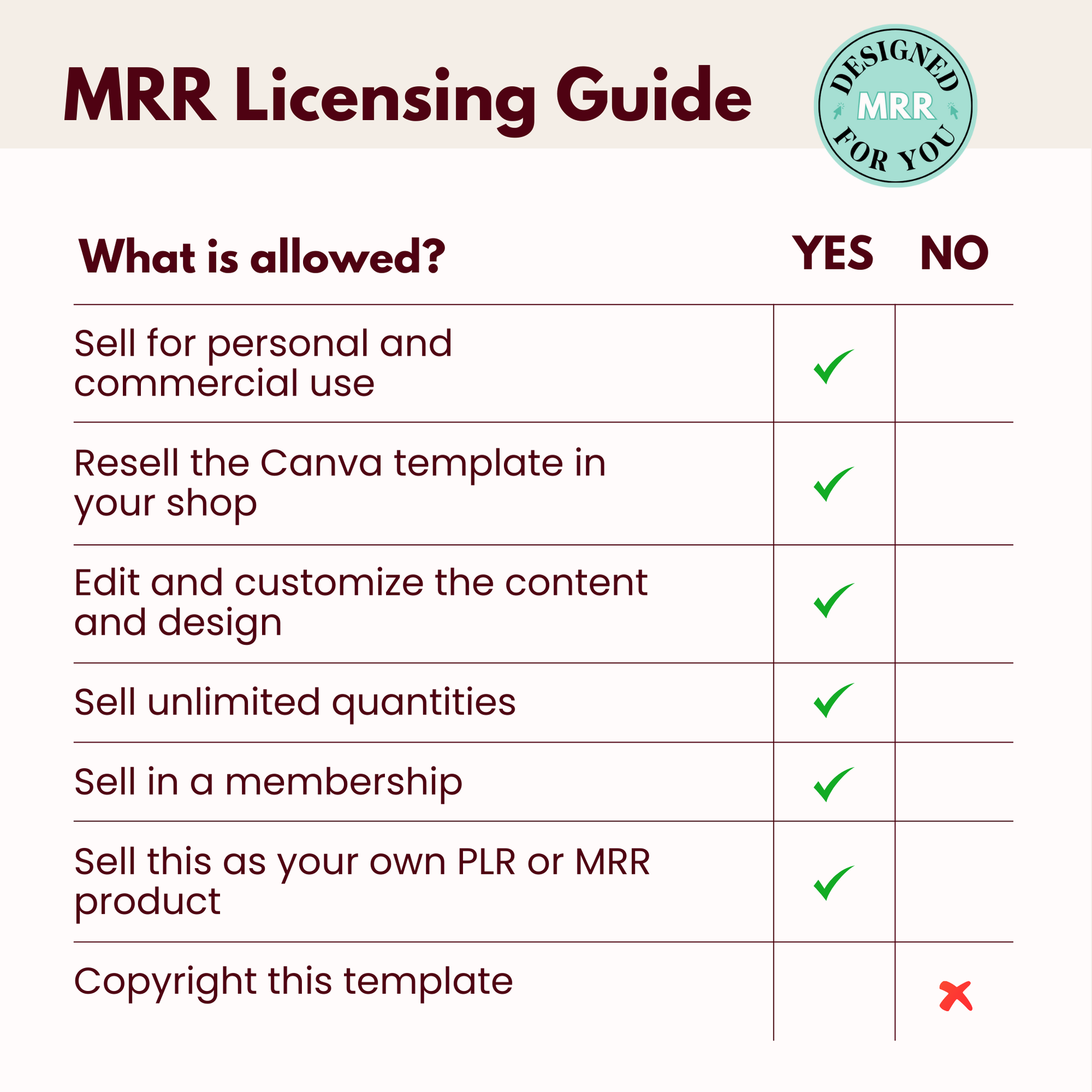 You have the permission to sell the editable Canva file rights to your customers, enabling them to resell the product under MRR as well.