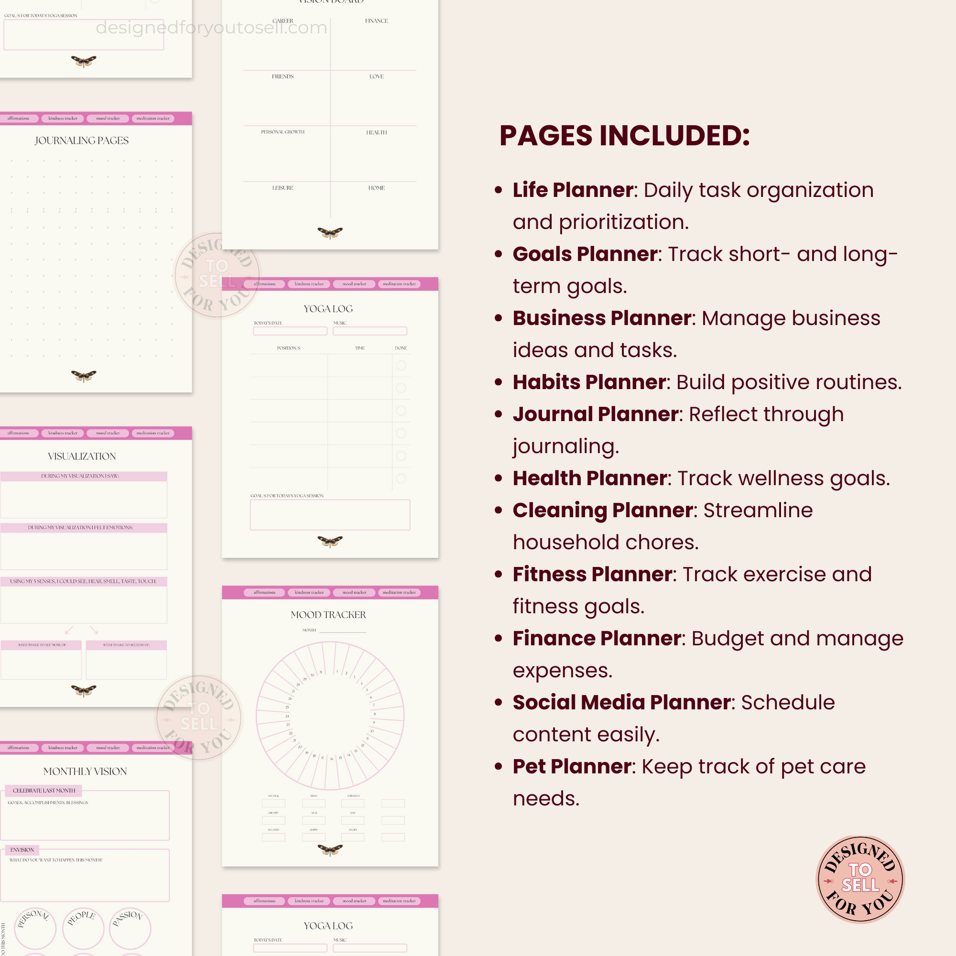 This 146-page ADHD Planner is a comprehensive tool designed to streamline daily life and support organization. It includes sections for managing daily tasks, tracking short- and long-term goals, organizing business ideas, building positive habits, and reflecting through journaling. With dedicated pages for health, fitness, and wellness goals, as well as cleaning, budgeting, and expense tracking, this planner covers all areas of personal and professional life. Additional sections for social media scheduling and pet care ensure that every detail is accounted for in one organized place.