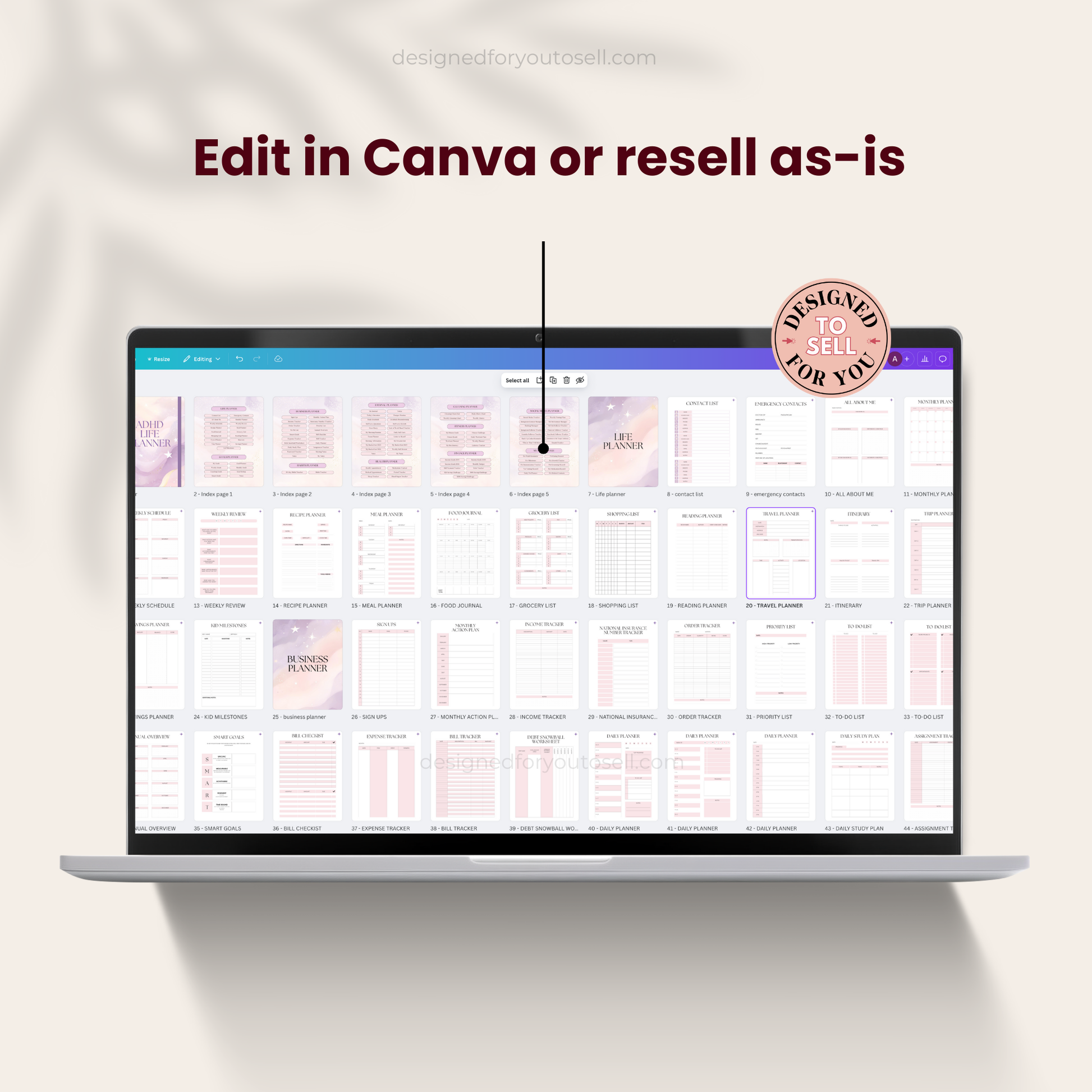 • 1 PDF with links to the editable Canva file which you can resell (can be used with Free and Pro Canva accounts).
