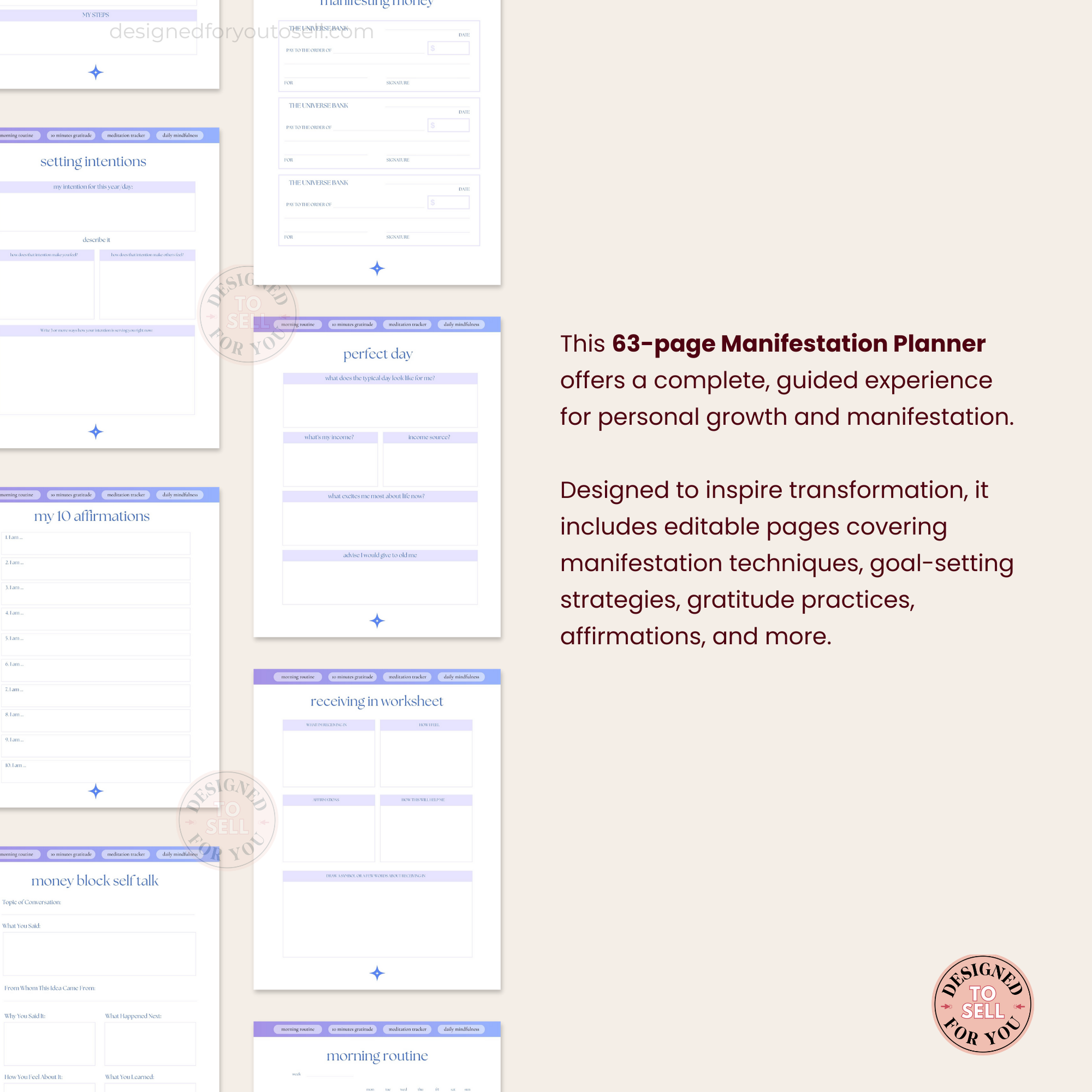 This 63-Page Manifestation Planner includes step-by-step guidance for setting intentions, goal setting to set and track personal aspirations, and gratitude practices such as daily and weekly reflections to encourage positivity.