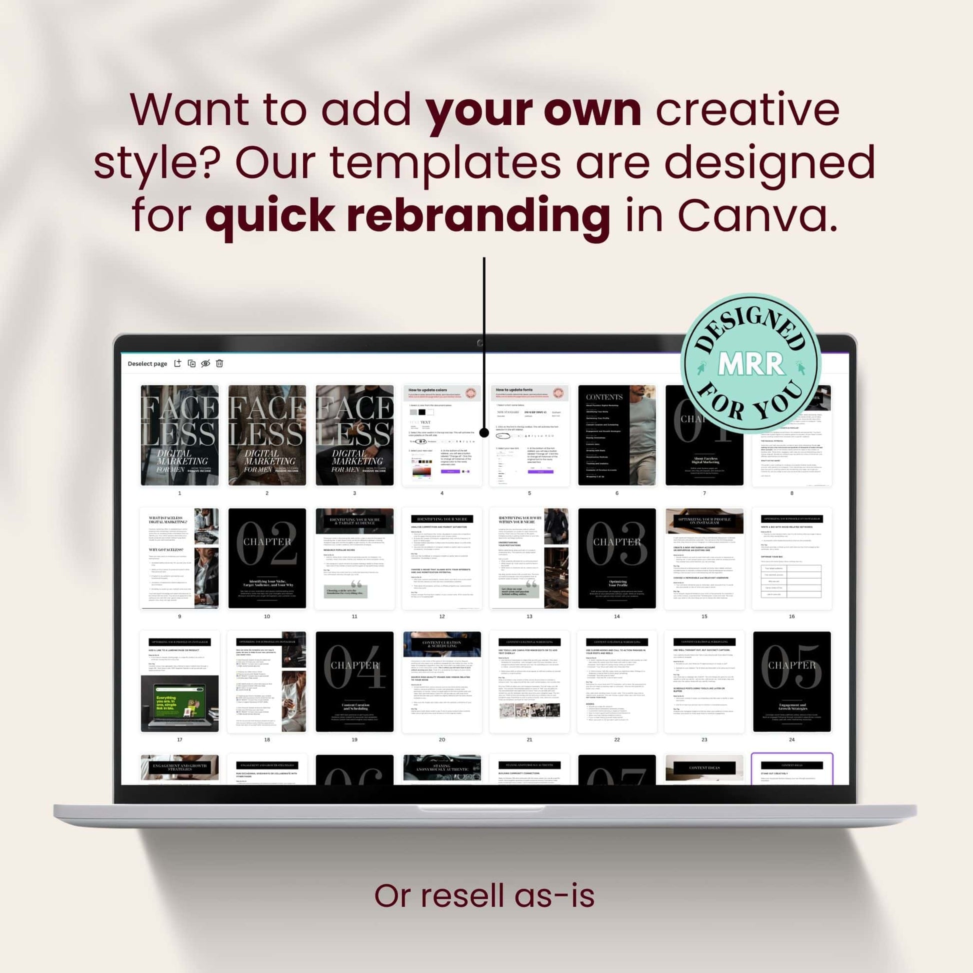 When you purchase our MRR products, you can transfer the resell rights to your customers when you sell to them. This enables your customers to sell the editable Canva file as an MRR product.