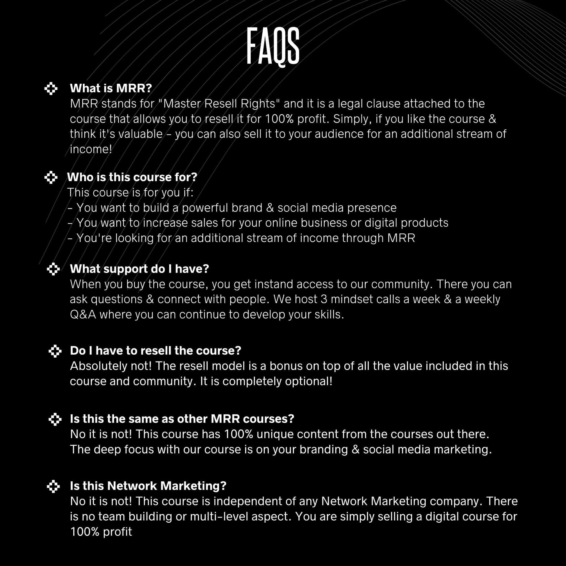 The best part? It comes with Master Resell Rights!! Which means that when you buy this course, you also buy the right to re-sell it for 100% profit!